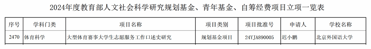近日,2024年度教育部人文社会科学研究一般项目立项名单正式公布。体育教研部迟小鹏副教授申报的项目获教育部人文社会科学研究规划基金项目立项。