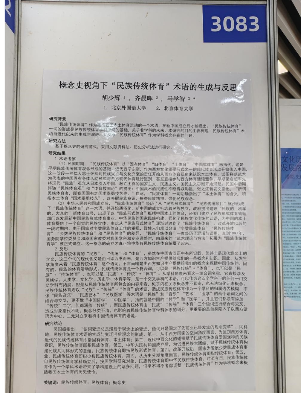 我校体育教研部胡少辉老师撰写的两篇学术论文经严格评审被大会录用。其中,《新时代体育铸牢中华民族共同体意识的逻辑理路与实践路向》一文在专题报告环节进行交流;《概念史视角下“民族传统体育”术语的生成与反思》一文参与墙报交流。两篇论文展现了北外体育教研在理论探索与跨学科研究方面的积极尝试,引起了与会学者的关注与讨论。