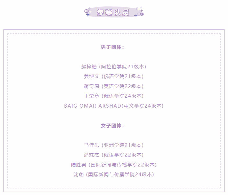 经过两天的激烈角逐,北外全体参赛队员团结协作,顽强拼搏。最终亚洲学院马佳乐、俄语学院潘姝杰、国际新闻与传播学院陆胜男和沈璐携手夺得女子团体亚军;阿拉伯学院赵梓皓、英语学院蒋奇原、中文学院BAIG OMAR ARSHAD以及俄语学院姜博文和王荣章获得男子团体第六名的优异成绩。