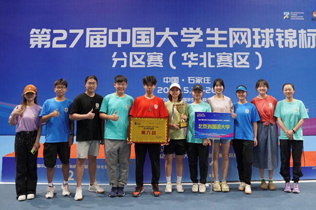 5月23日至26日,第27届中国大学生网球锦标赛分区赛(华北赛区)在石家庄举行。北京外国语大学网球队由体育教研部李娜老师带队,吴玥瑶、王乐知、沈昕、刘敬妤、靳皓然、赵康洲、于珺垚、马铭8名队员参赛。在激烈的角逐中,网球队全体成员沉着冷静、不畏强敌、竭尽全力,最终摘得女子甲组团体亚军、男子甲组团体第六名的成绩,集体获得全国总决赛晋级资格。