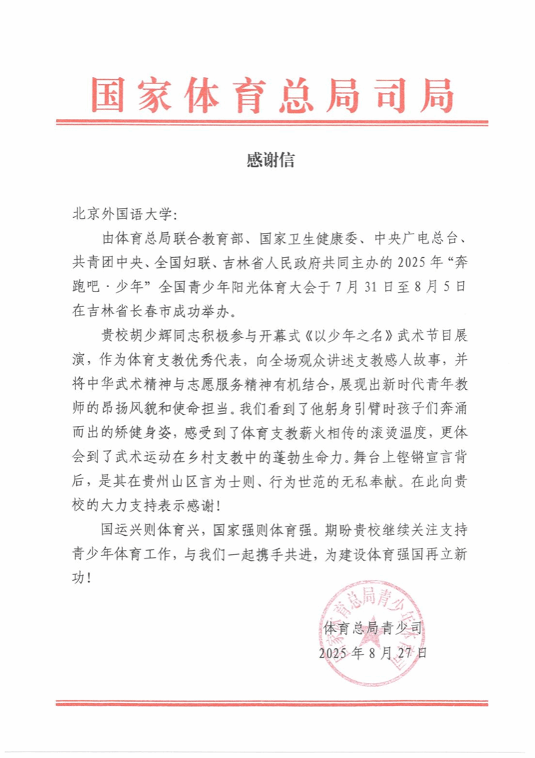 近日,国家体育总局青少司向我校发来感谢信,对我校体育教研部青年教师胡少辉参加国家体育总局、国家卫生健康委、中央广电总局、共青团中央、全国妇联、吉林省人民政府七部委联合举办的2025年“奔跑吧 少年”全国...
