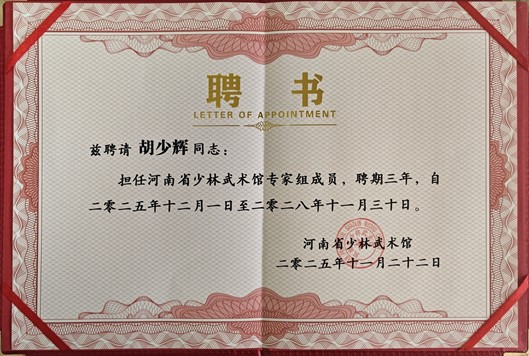 2025年12月7日,河南省少林武术馆专家组成立大会暨第一次工作会议在河南登封召开。北京外国语大学体育教研部教师胡少辉应邀出席,并受聘成为该馆首批专家组成员。河南省少林武术馆是由原国家旅游局和河南省人民...